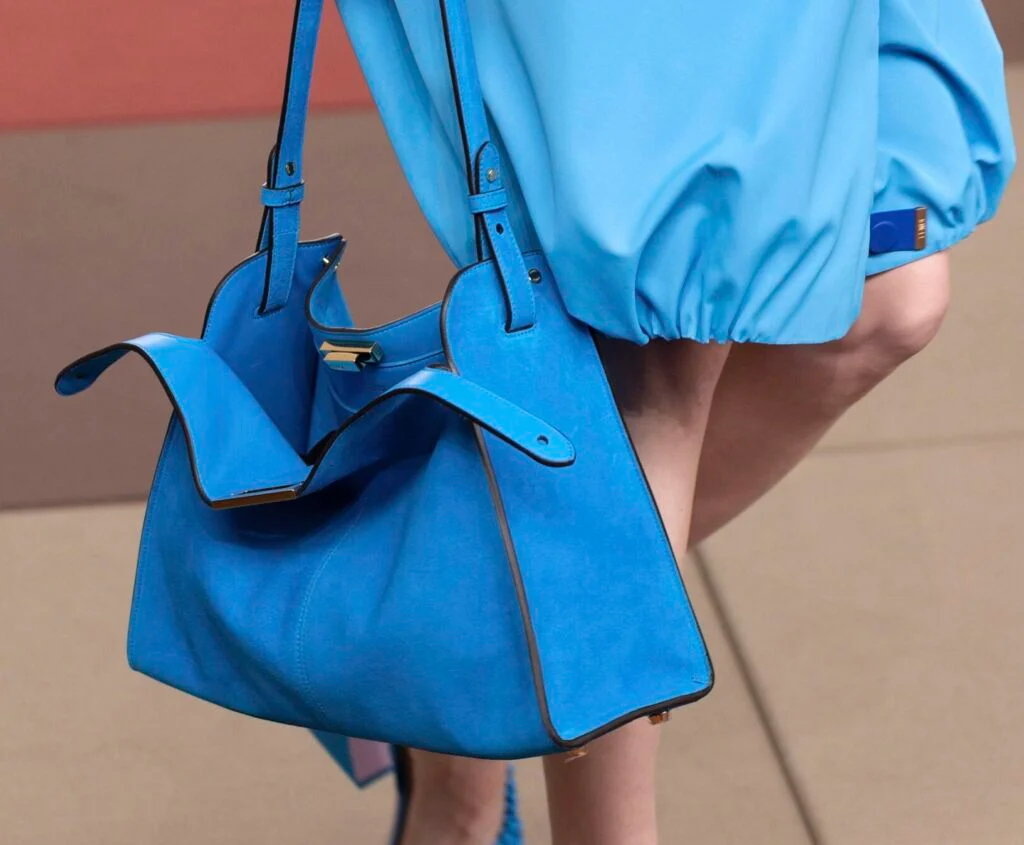 Creado en dos tamaños, grande y mediano, se ofrece en sorprendentes combinaciones de materiales y colores. Las variantes bicolor en tonos de piel atemporales se combinan con interiores de ante en tonos vibrantes, desde marrón con lila hasta gris paloma con azul eléctrico. Las versiones monocolor llamativas en rosa vivo y azul turquesa son, a la inversa, de ante con interiores forrados en piel.