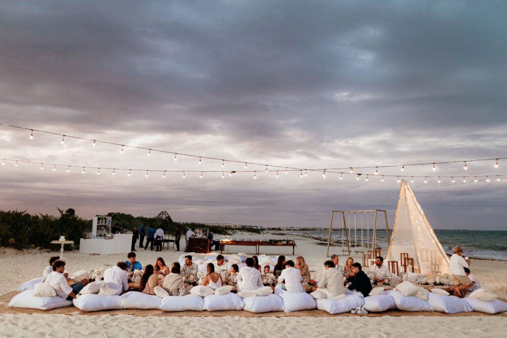 Al atardecer, la playa se transforma en el escenario de una celebración íntima y elegante, marcada por un ambiente boho chic y el sonido del mar como telón de fondo. El espacio es ambientado con caminos iluminados, un teepee decorativo y columpios frente al mar, creando una atmósfera acogedora y cuidada en cada detalle. La experiencia comienza acompañada de cócteles tropicales, dando paso a una propuesta gastronómica pensada para compartir, con una parrillada especial con langosta y platillos como pulpo, camarones al coco, tataki de atún y ensalada caprese.