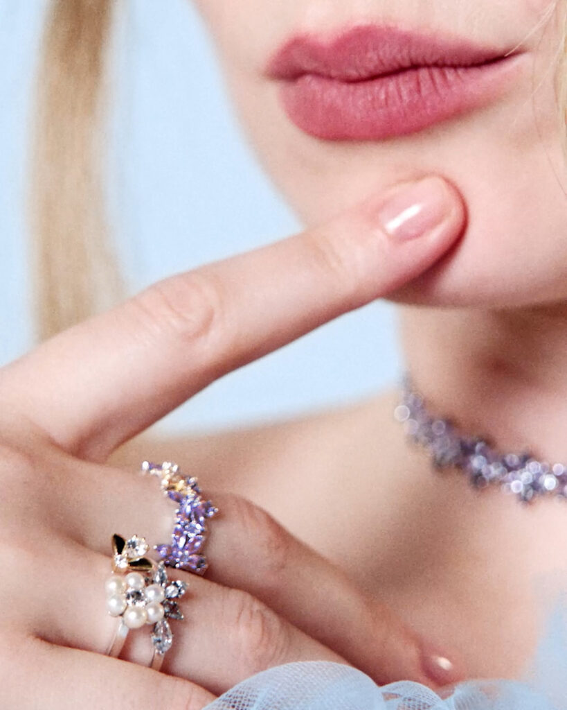 Flores exquisitamente detalladas y terminadas a mano —que en su momento transmitían mensajes secretos de devoción y amor— se combinan con perlas y moños en alegres tonos pastel, incluido el lila de la glicina que adorna el universo Bridgerton. Desde ear climbers hasta collares, las piezas pueden superponerse de distintas maneras, invitando a la imaginación y a la autoexpresión de quien las lleva.