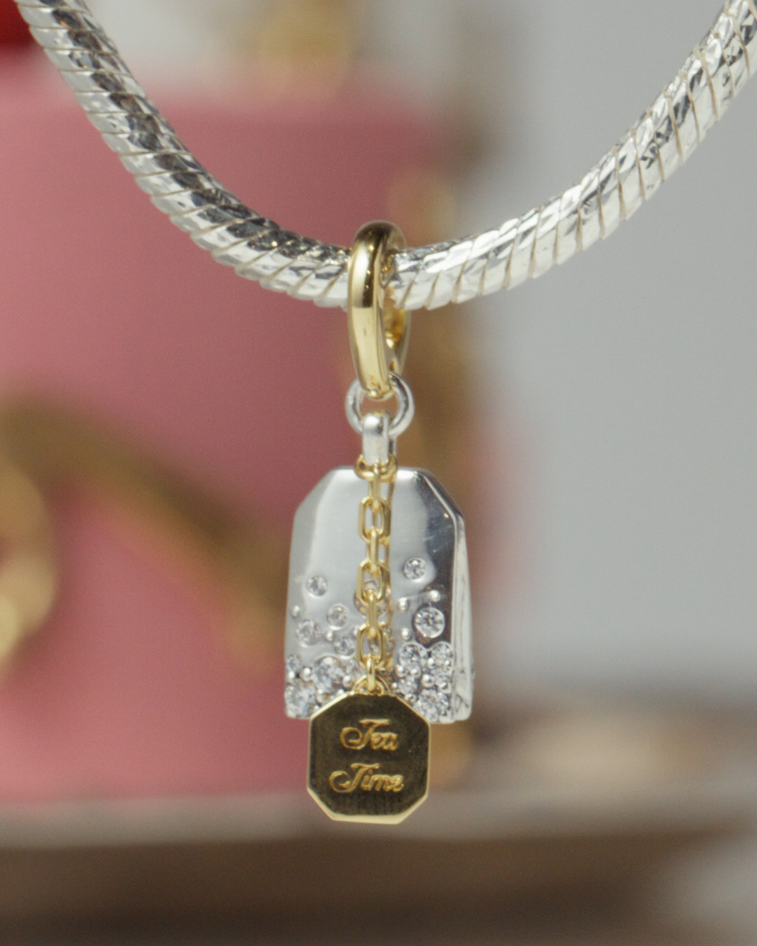 La abeja, que en la joyería sentimental de la era georgiana simbolizaba la laboriosidad y la comunidad, es un ícono recurrente a lo largo de Bridgerton. En la imaginación de Pandora, la abeja revolotea de forma seductora alrededor de una flor de pétalos de perla en uno de los anillos y acentúa delicadamente las gemas de un choker con borlas en forma de cinta. Un moño Bridgerton funciona como el signo de exclamación perfecto en un aro que se abre paso mientras asciende por la oreja. Incluso hay espacio para “derramar el té” al estilo Lady Whistledown con un charm de bolsita de té engarzado con gemas.