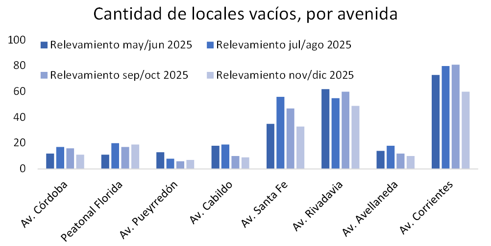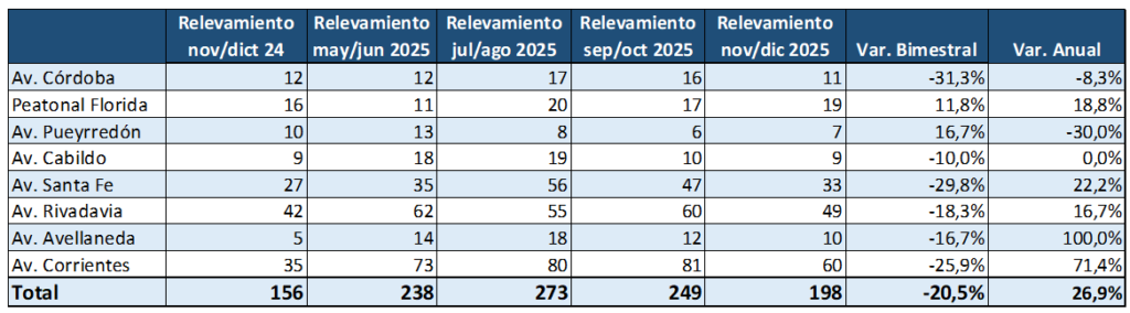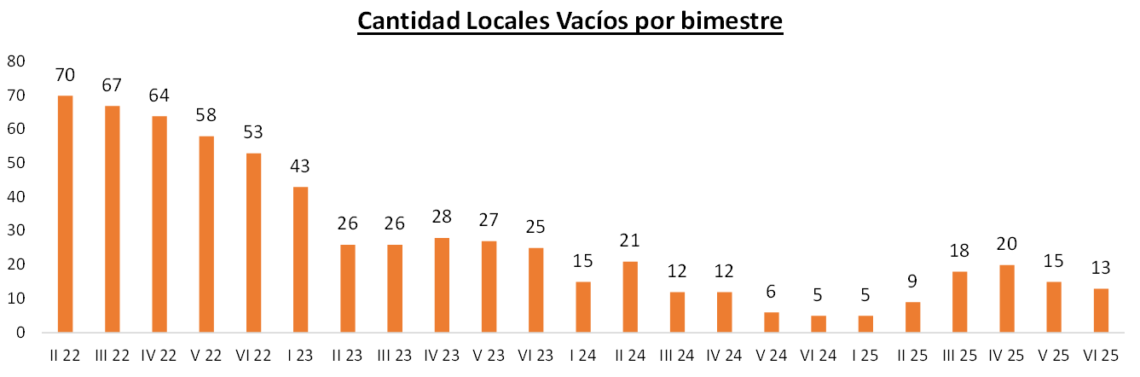 En el bimestre noviembre-diciembre de 2025, la cantidad de locales vacíos mostró un aumento del 26,9% en relación al mismo período de 2024. Comparado con septiembre-octubre de 2025, hubo una baja del 20,5%.