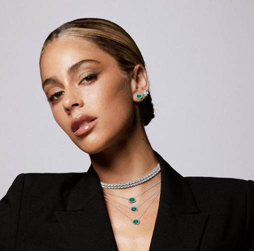 Los protagonistas indiscutidos son las joyas de Pandora: collares en layering con piedras verdes, un choker con brillo sutil y aros que acompañan en la misma paleta. El juego de alturas y texturas genera un efecto visual sofisticado, donde el esmeralda resalta sobre la piel y el negro, aportando luz y profundidad.