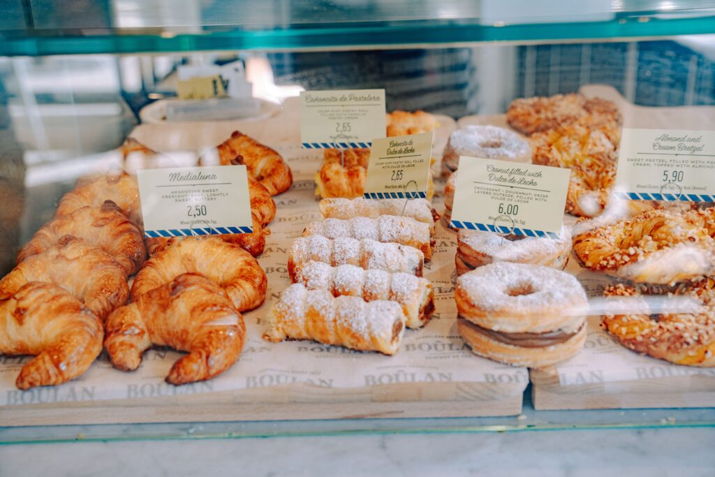Las medialunas, emblema indiscutido de Boûlan, ocupan un lugar central en la carta, junto a otros clásicos muy queridos por su público: el alfajor de maicena, el cañoncito de dulce de leche y el carrot cake. En panadería, se destacan piezas icónicas como la Bayolette, una baguette rústica artesanal, la Rechessa, focaccia genovesa de la casa, y una línea de panes elaborados con masa madre de perfil sourdough, inspirados en el estilo de San Francisco y especialmente valorados por el público local.