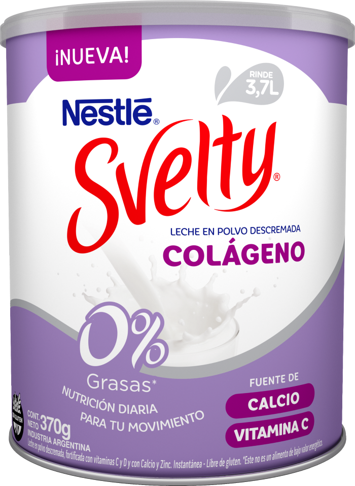 Svelty® Colágeno combina todos los beneficios naturales de la leche con una fortificación exclusiva de calcio, colágeno y vitamina C para ayudar a mantener la salud de huesos, piel, cabello y uñas, en un formato fácil de incorporar a la rutina diaria. Cada vaso proporciona 0,9 g de colágeno. Dos vasos de Svelty® Colágeno no solo aportan el 80% del calcio recomendado por día, sino también vitamina C, que es fundamental para la síntesis de colágeno en el organismo.