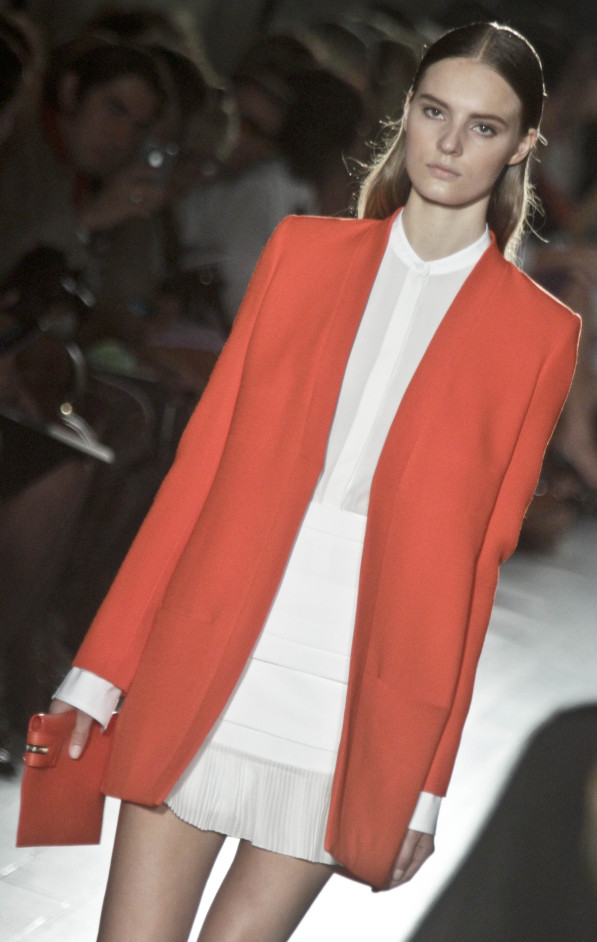 Se llevan los colores fuertes como el naranja. el amarillo, el turquesa, el azul klein…Llévalos en americanas, combinadas con otras prendas en tonos más discretos como el blanco o el negro. Esta foto es una propuesta de Victoria Beckham.